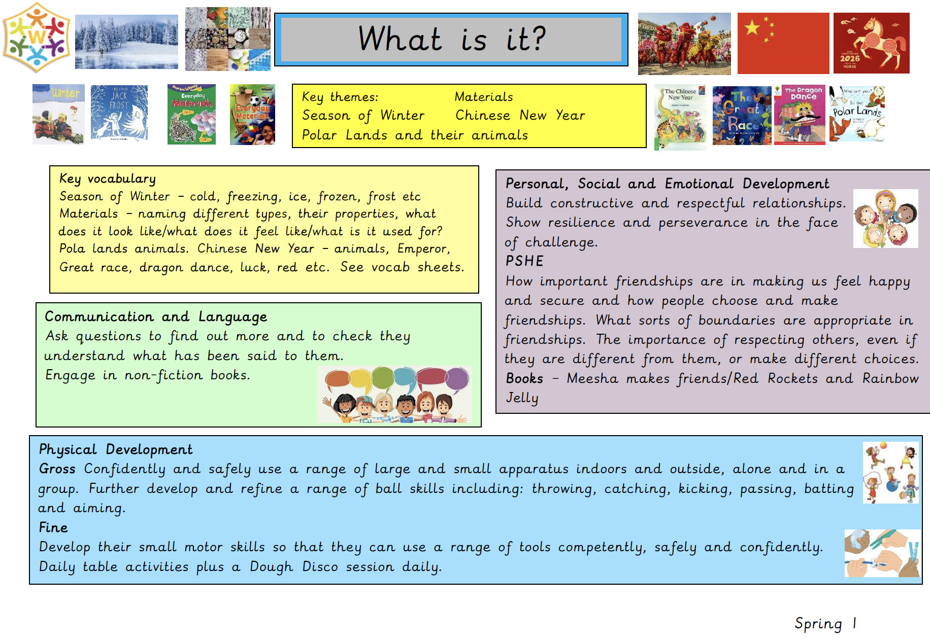 This half term's topic is ‘What is it?’ The children will be learning about materials and their properties, the season of winter, The Polar lands and Chinese New Year. The children will be experimenting with lots of different materials, and experiencing some food tasting!